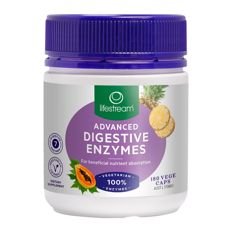 Lifestream BowelBiotics+ Advanced Digestive Enzymes capsules are an exciting addition to the bowel health range of products. The unique formula is made up of a comprehensive range of digestive enzymes that are derived from vegetarian sources. The enzymes include those that aid the digestion and metabolism of fat, carbohydrates and proteins.Raw foods such as fruits and vegetables are excellent sources of enzymes, but these enzymes are often inactivated or destroyed when the food is processed, canned, or cooked. The Advanced Digestive Enzymes formula is designed specifically to support digestion for people who eat the typical modern diet which is high in protein, fat and refined carbohydrates. The formula contains a proprietary blend of enzymes specifically designed to aid the digestion of these nutrient dense meals.Supplementation with digestive enzymes helps to replace those lost in food processing and cooking. Advanced Digestive Enzymes do not contain any fillers, binders or coatings and are wholly vegetarian.