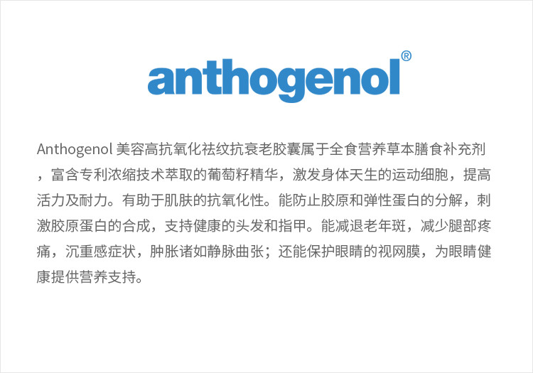 - 中文名稱 :Anthogenol 高濃度花青素葡萄籽精華膠囊 100粒 (月光寶盒)
