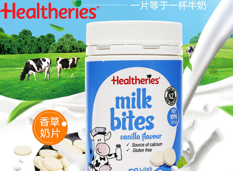 - 中文名稱 :Healtheries 賀壽利 牛奶片咀嚼片 兒童/成人補鈣 (香草味) 50片