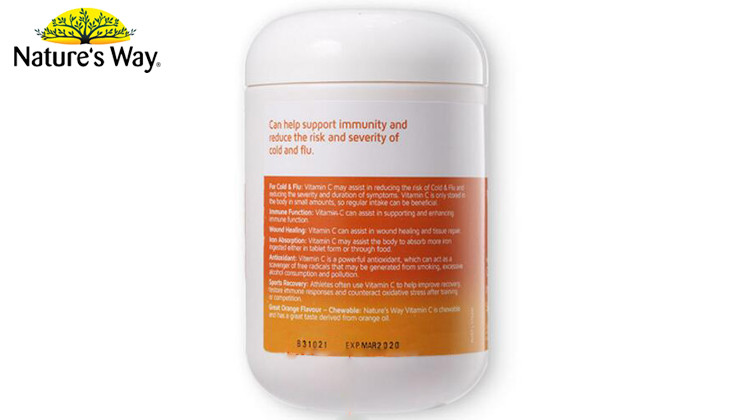 Nature's Way 佳思敏 500mg維生素C片(桔子味)富含維他命C,可幫助預防感冒及流感,減少癥狀持續時間及癥狀程度,經常服用維他命C含片還可幫助預防感冒及流感。