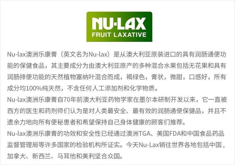- 外文名稱 :Nu-Lax Fruit Laxative 500g