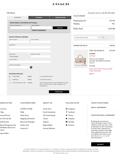 在Coach英國官網購買物品,郵寄英國地區(不包括Channel Islands和Gibraltar)都可享受Standard Delivery包郵服務,3-5個工作日到達。你也可以選擇付費的Express Delivery服務(£9.95)或是Next Day Delivery(£14.95),前者2個工作日送達,后者則只需1個工作日送達。
