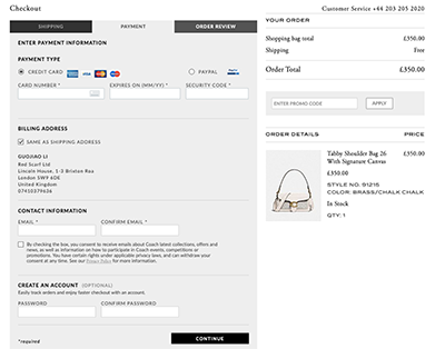 3. 下一步就要準備付款啦。可以看到Coach官網支持Visa、Mastercard、American Express、Paypal。這個時候只需要選擇自己想要支付的方式并填寫正確的賬戶信息啦。委員在這里小小提示一下大家,Billing Address和Delivery Address是有一些小差別的。Delivery Address就是你需要網站把你訂購的商品寄送到的地方,而Billing Address就是銀行賬單寄到的地址。一般在英國境內這兩個都是一致的,如果使用的卡不是本地的,這兩個填寫的地方就需要自己注意了喲!