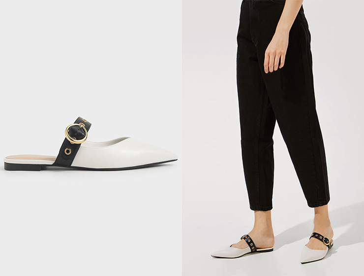 這雙來自“小CK”的穆勒平底鞋是今夏超熱門的涼鞋款式。尖頭白色鞋身搭配黑色打孔系帶,大方又百搭,而且對比撞色的設計還很修飾腳型哦。無論是搭配甜美范兒的小裙子,還是休閑風的牛仔褲,都不違和。關鍵是價格也很合理哦。