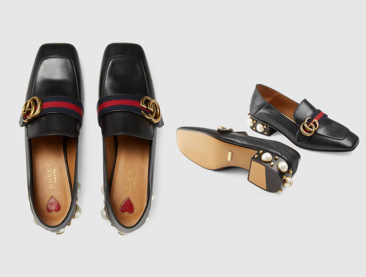 Gucci這雙Loafer小皮鞋既舒適便捷,又不失高雅精致。傳統的三色條紋和雙G標組合在一起,極具辨識度。鑲在鞋跟上的珍珠和鉚釘再添一絲華麗感,但又不會過于浮夸;鞋里的兩顆小紅心是Gucci專屬的復古味道。風格上“進退自如”,從禮服到潮Tee沒有不能搭的!可塑性如此強的一雙美鞋,預算充足的寶寶們,快點買給你心愛的她!