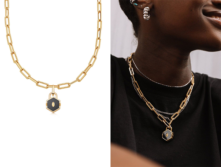 來自英國的珠寶品牌Missoma是時尚界冉冉升起的一顆新星,款式、質量、性價比都很優秀。這款項鏈是品牌剛推出不久的新品,精致的六邊形小鎖頭樣式,打開后可以裝下一張小照片。給你們一個小Tips:把你的帥氣照片或者你們的浪漫合照放進去一起送,驚喜升級!