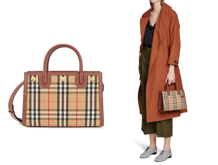 如果說前兩個包適合帥氣個性的寶寶,那這款包就是優雅的代名詞。這款中型的Tote包外形規整大氣,標志性的Burberry花紋和顏色,經典又有辨識度。這款包除了手拿還可以斜挎,就算是簡簡單單的白T牛仔,配上這款包都瞬間有了優雅和尊貴的感覺呢。