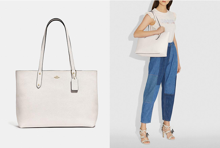相比于很多奢侈大牌,COACH算是預算不是太多的寶寶們也可以購買的輕奢品牌。這款白色Tote的的包身簡單搭配金色的logo,干凈清新,露出的黑色邊緣讓包包更加有設計感,亮眼了很多!作為一個合格的通勤包,它可以容納13英寸的筆記本電腦、錢包、化妝包、甚至塞一雙舒適的平底鞋都不在話下。拉鏈的設計擠地鐵時也安全感十足,拋光卵石皮革的材質非常耐磨,實用屬性滿分。