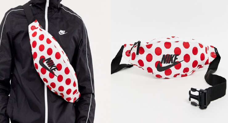其實波點元素也能和男生的潮流單品融合在一起呢,比如耐克這款胸包。白色的包身上印滿了紅色圓點,加上正中間的NIKE Swoosh Logo,帶來了與眾不同的感覺。酷似橄欖球的外形,搭配黑色的包帶,一次性將運動風和街頭風呈現出來,讓小哥哥們可以輕松打造休閑時尚的造型!