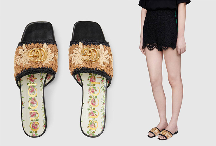 Gucci這款草編拖鞋一上市的時候委員就覺得荷包是捂不住了…… 深棕、淺棕和黑色的草編混合出了相當精致的花紋,“重量級”的雙G標志經典又高級,甚至連鞋子里面都是小碎花,這種360度無死角的設計真的很圈粉?。⊥闲目钍绞娣址奖悖钆淙棺友澴佣疾皇菃栴}。是一款既適合度假旅行拗造型又可以在日常生活中輕松駕馭的草編鞋哦。