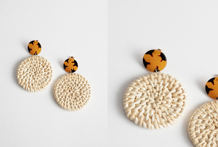 這款耳環來自& Other Stories,兩片圓圓的紐扣造型設計簡約又很顯臉小,淺米色的草編和豹紋花樣的碰撞更顯時尚。搭配吊帶牛仔褲或者小豹紋,是打造性感度假風的一把好手沒錯了!