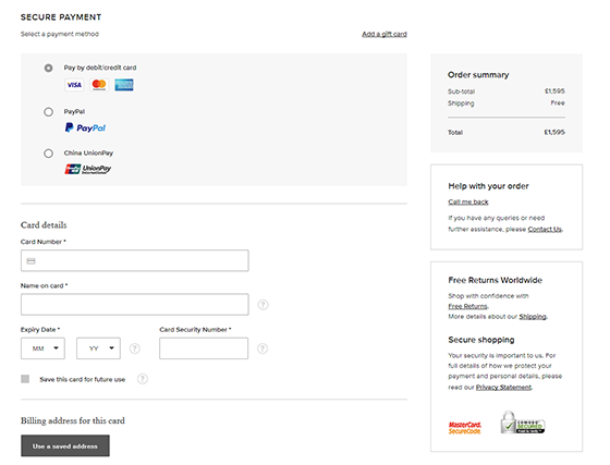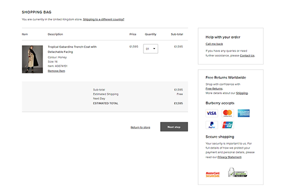 2. 選擇好自己適合的款式進(jìn)入購(gòu)物車(chē)之后就可以開(kāi)始Check Out了。在頁(yè)面右邊可以看到Burberry官網(wǎng)支持Visa,Mastercard,American Express,Paypal和中國(guó)銀聯(lián)卡Union Pay。所以如果你剛來(lái)英國(guó)沒(méi)有英鎊卡,也不用擔(dān)心買(mǎi)不了Burberry啦,國(guó)內(nèi)有銀聯(lián)標(biāo)識(shí)的銀行卡也是可以付款的。