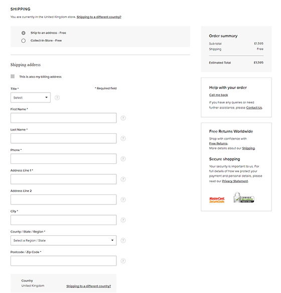 3. 下一步就是填寫(xiě)Delivery的相關(guān)信息。首先在頁(yè)面的最上方,大家可以看到有兩種取貨方式:店內(nèi)取貨,寄送到家。在UK境內(nèi)所有的訂單不管是在店內(nèi)取貨,還是寄送(包括Next Day和Saturday)到家都是免費(fèi)的。所以大家填寫(xiě)好自己的郵編,地址,就可以往下拉,選擇是否要進(jìn)行Gift Packaging。比如說(shuō)你在Burberry給親朋好友買(mǎi)禮物的話,就可以點(diǎn)擊這個(gè)選項(xiàng),讓禮物變得更“高大上”一點(diǎn)。