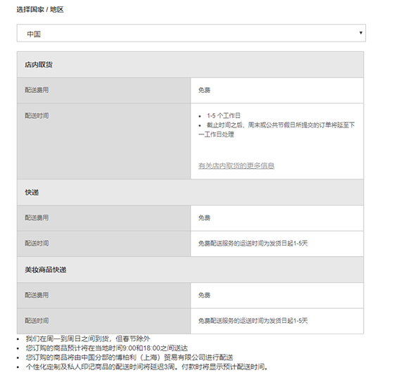 下面是在Burberry中國(guó)官網(wǎng)郵寄的相關(guān)事件和信息,跟英國(guó)官網(wǎng)同樣的是,不管是店內(nèi)取貨還是快遞都是免費(fèi)的。