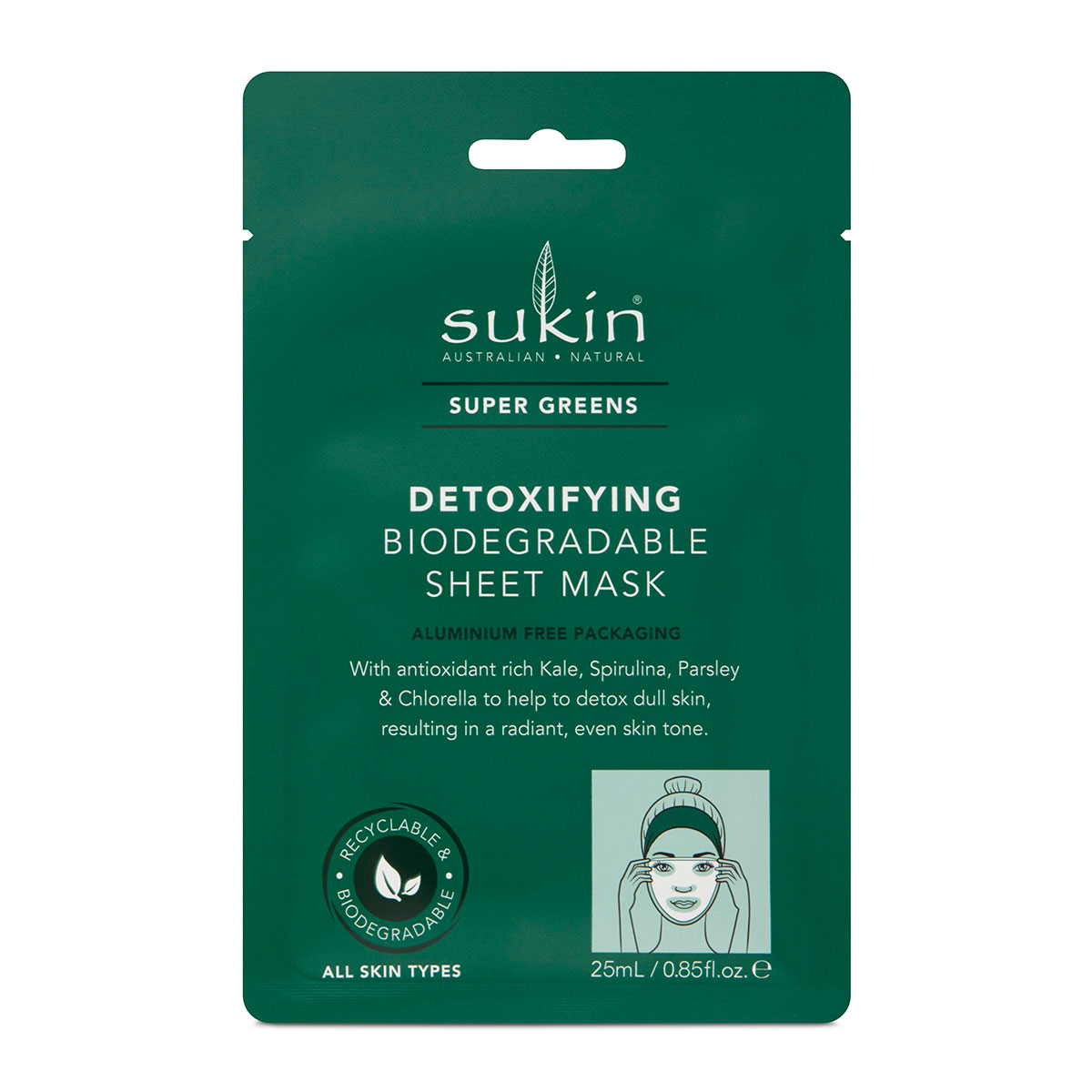 This Sukin Super Greens Detoxifying Sheet Mask is enriched with Super Greens Serum featuring a blend of Kale, Spirulina, Parsley & Chlorella With antioxidant rich ingredients to detoxify and revitalise dull skin, leaving skin hydrated and feeling radiant This sheet mask is made with 100% natural Cotton fibres that will Biodegrade 6 months after use
