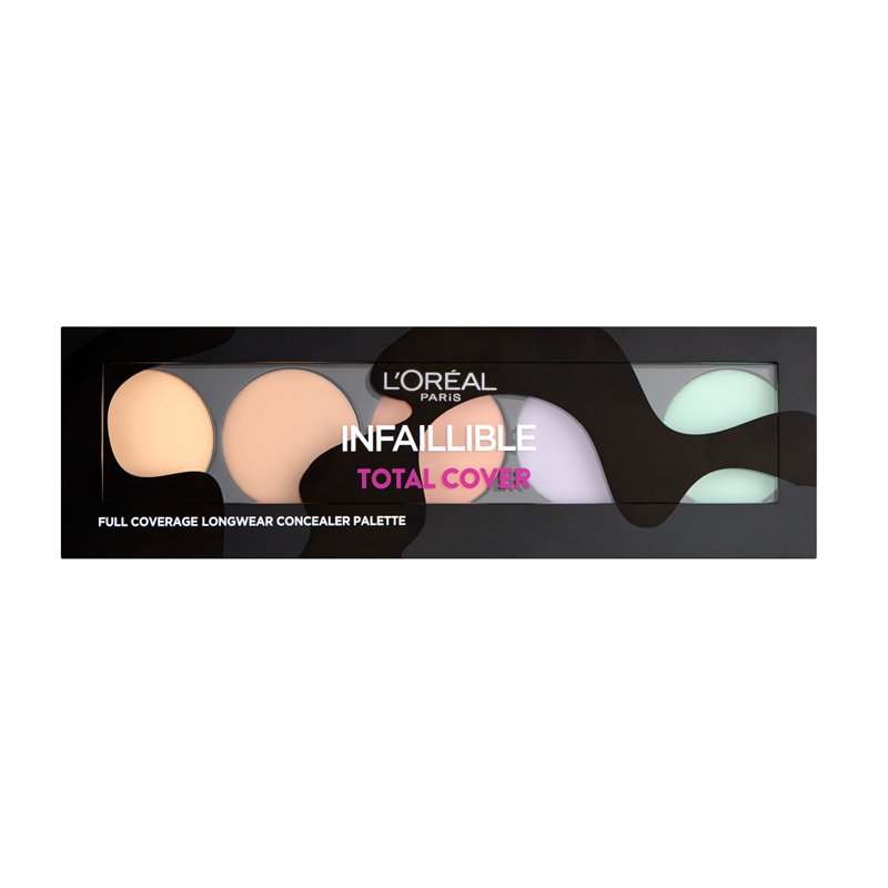 L Oréal Paris Infallible Total Cover Concealer Palette is the 1st concealer palette with 2 high coverage, colour-correcting shades and 3 shades to conceal The lightweight formula allows you to layer multiple colours without the overload, leaving an even, smooth finish