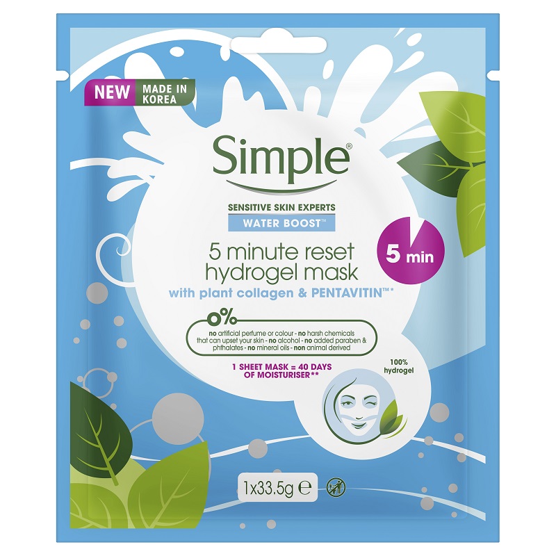 Simple 清妍 5分鐘賦活水凝膠面膜 一種由植物膠原蛋白和五肽組成的強效保濕面膜,僅需5分鐘,就能提供40天的保濕作用,讓你擁有健康滋潤的肌膚,遠離骯臟,充滿快樂。使用礦物質(zhì)和植物提取物,純素的,PETA認證,不含酒精,不添加對羥基苯甲酸酯,不含鄰苯二甲酸鹽,不含刺激性化學物質(zhì)和香精。