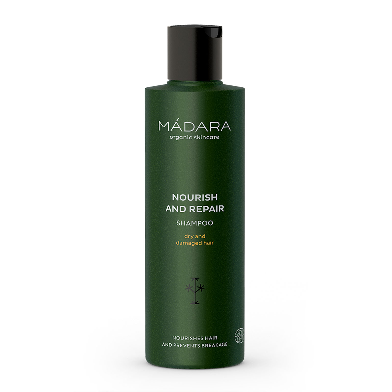 Discover the Madara Nourish And Repair Shampoo a rich and silky shampoo Gently cleanses and repairs dry, damaged hair Hair becomes reinforced and naturally smooth For damaged, brittle and bleached hair