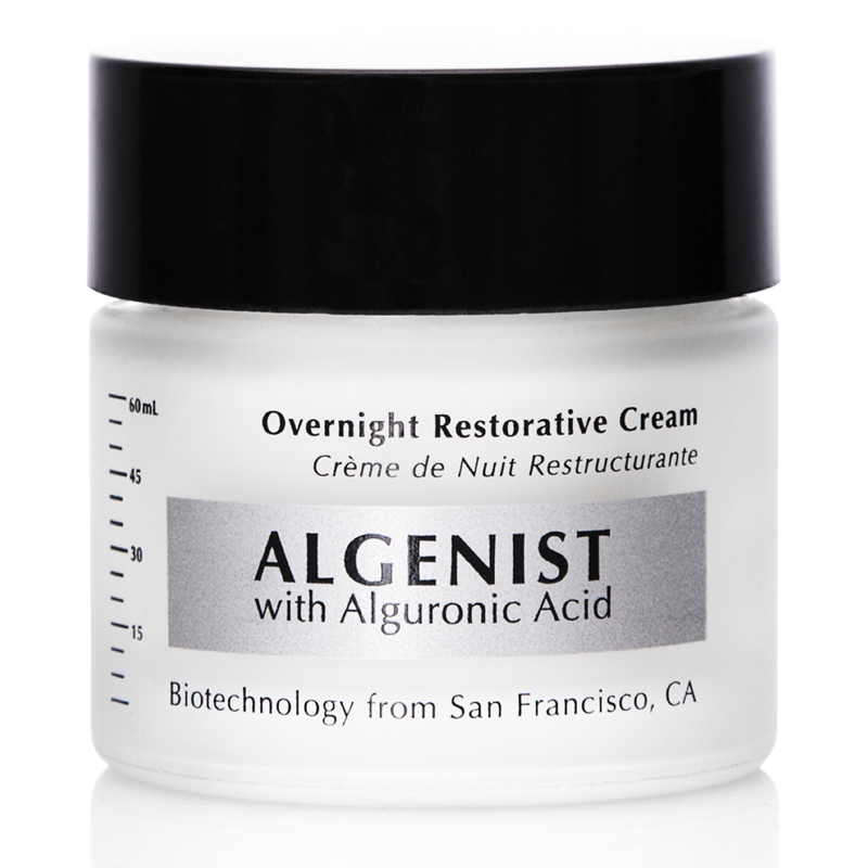 "The regenerative power of Alguronic Acid, ALGENIST Overnight Restorative Cream promotes cell renewal to improve skin structure while peptides nourish the skin and reduce the appearance of lines and wrinkles Firmness and elasticity are restored and skin is smoother and more radiant in the morning