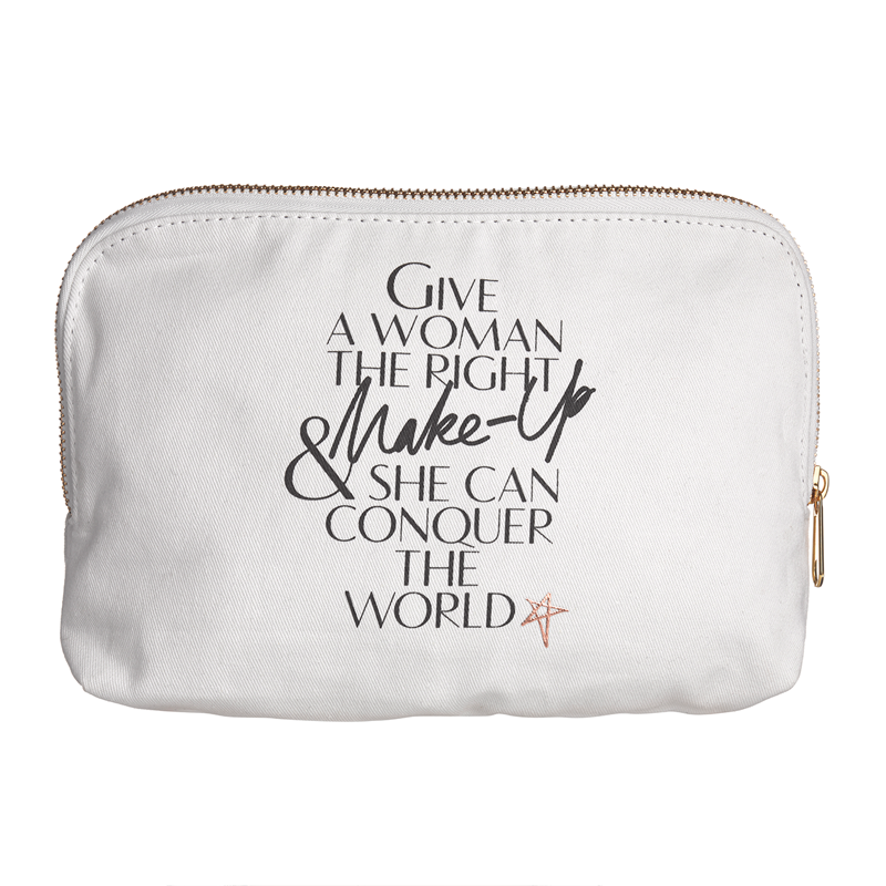 A cotton canvas makeup bag printed with the fabulous lip prints of some of the most iconic women in fashion It s the perfect size for holding all your makeup when you re on the go! The bag has a gold zip, black lining and is machine washable