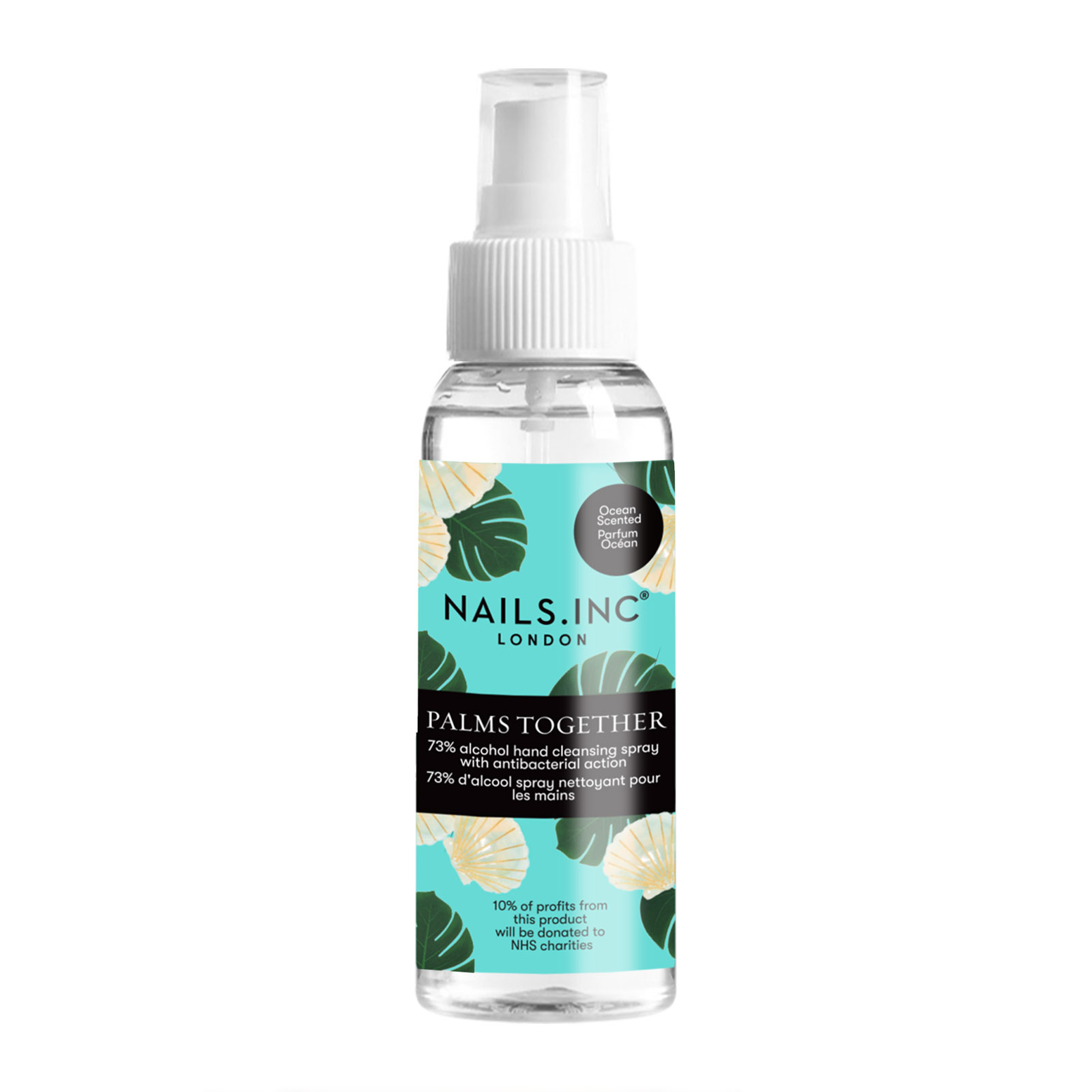 This anti-bacterial, hardworking NAILSINC Palms Together Sanitiser Spray Ocean Scent is 73% alcohol, enriched with soothing and moisturising aloe vera extract to clean, protect and hydrate hands without the need to rinse