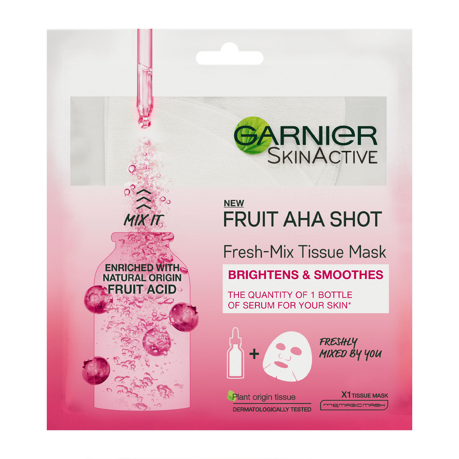 Fine lines? Uneven skin texture? You need a shot of hydration! Discover Garnier Fresh-Mix Sheet Mask Fruit AHA Shot! Freshly mixed by you when you need it, it gives your skin a hydrating shot enriched with Fruit AHAs for skin that looks suppler and smoother