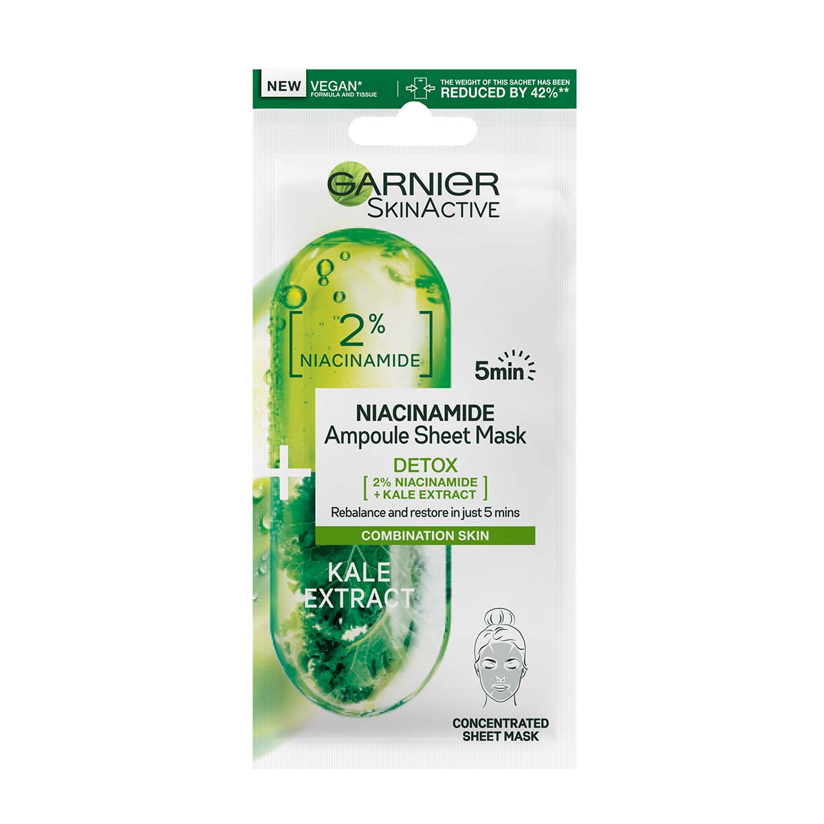 This fast action Garnier SkinActive Niacinamide Detox Ampoule Sheet Mask combines a potent derm active with a natural origin ingredient for a hydrating detox that rebalances dry and oily areas in just 5 mins! Niacinamide helps to visibly rebalance skin, and is known to target excess sebum and blemishes Kale is packed with vitamins and antioxidants