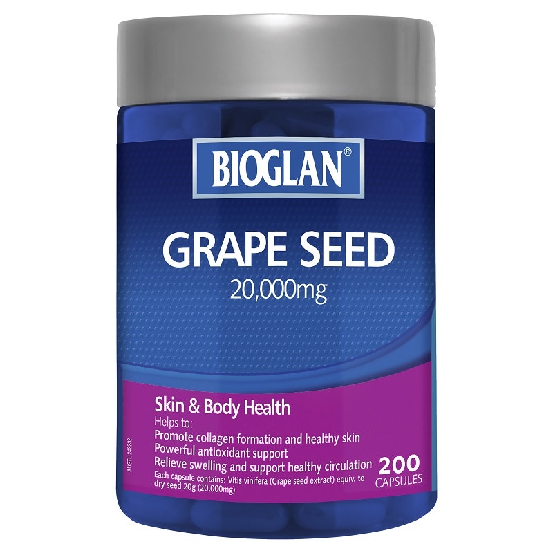 Bioglan 葡萄籽膠囊 20000mg(抗氧化)中的葡萄籽的主要提取物是原花青素(OPC),具有美白祛斑的功效:因為原花青素具有抗氧化能力,是維他命E的50倍,是維他命C的20倍,能延緩老化,預防動脈硬化,也有皮膚維他命之稱,具有脂溶性及水溶性的特質,具有的美白祛斑作用。