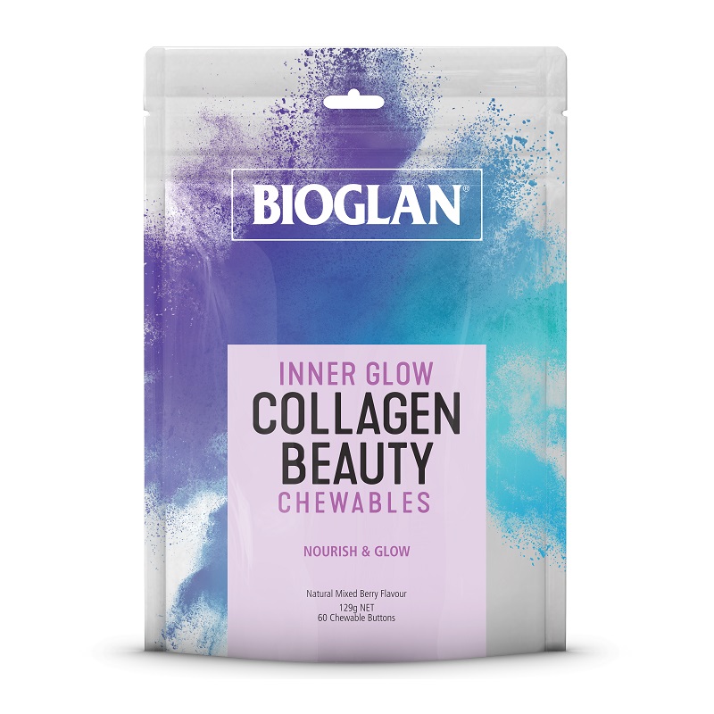 Bioglan 寶蘭 膠原蛋白咀嚼片含水解膠原蛋白、椰子水和蘆薈,從內到外滋養肌膚 。添加了來自針葉羅拉的維生素C、本地卡卡杜和戴維森李子,以及番石榴中的鋅,通過美味的無糖咀嚼片,幫助提升肌膚內在的光澤。