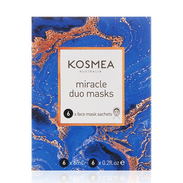Kosmea 奇跡二重奏小膜盒 包含:睡美人充電面膜 3件 和 小奶泥閃光燈面膜3件。添加霍霍巴油,卡卡杜李子和保濕糖分子,為肌膚提供強烈的水合作用,鎖水保濕。利用玫瑰果油和金盞花的治愈力量來平衡水分,鎮靜肌膚,提供深層滋養。精萃洋甘菊花舒緩鎮靜皮膚,玫瑰果顆粒有效輕柔去除角質,展現肌膚自然光澤。