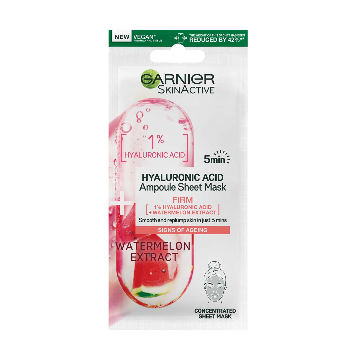 This fast action Garnier SkinActive Hyaluronic Acid Firming Ampoule Sheet Mask combines a potent derm active with a natural origin ingredient to replump the skin with moisture for skin that looks firmer in just 5 mins Hyaluronic acid is known for its hydrating properties, holding up to 1000x its weight in water