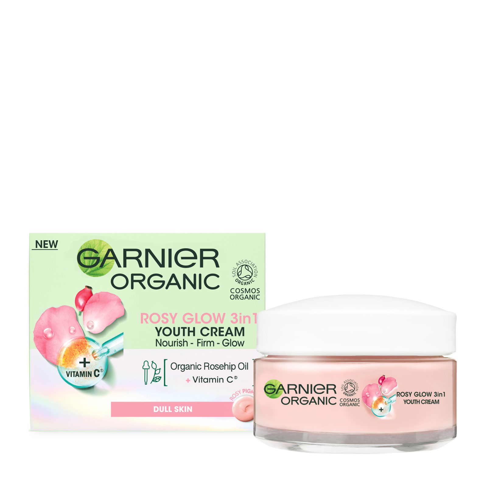 Say goodbye to dull skin and hello to skin so healthy it glows Get glowing skin you ll love, naturally! The Garnier Organic Rosy Glow 3in1 Youth Cream has been enriched with nourishing Organic Rosehip seed oil, and brightening Vitamin C, it reveals radiant, glowing skin