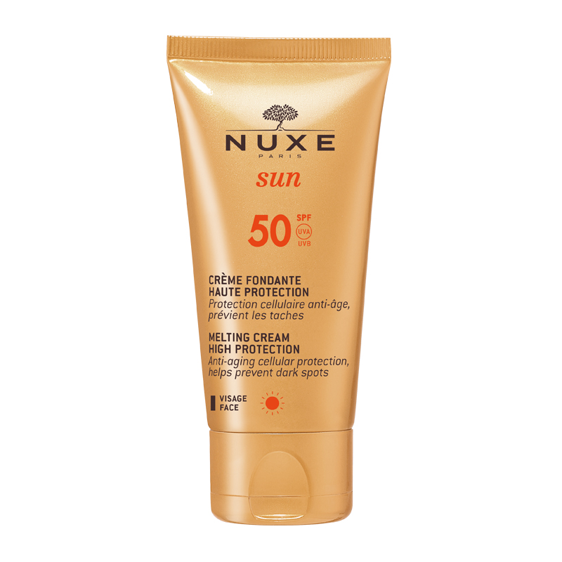 NUXE 歐樹 面部防曬霜 SPF50,內含向日葵和水花,可防止肌膚細胞老化,并幫助你獲得完美的古銅色肌膚。適用于白皙的皮膚和敏感區域(面部、領口)。