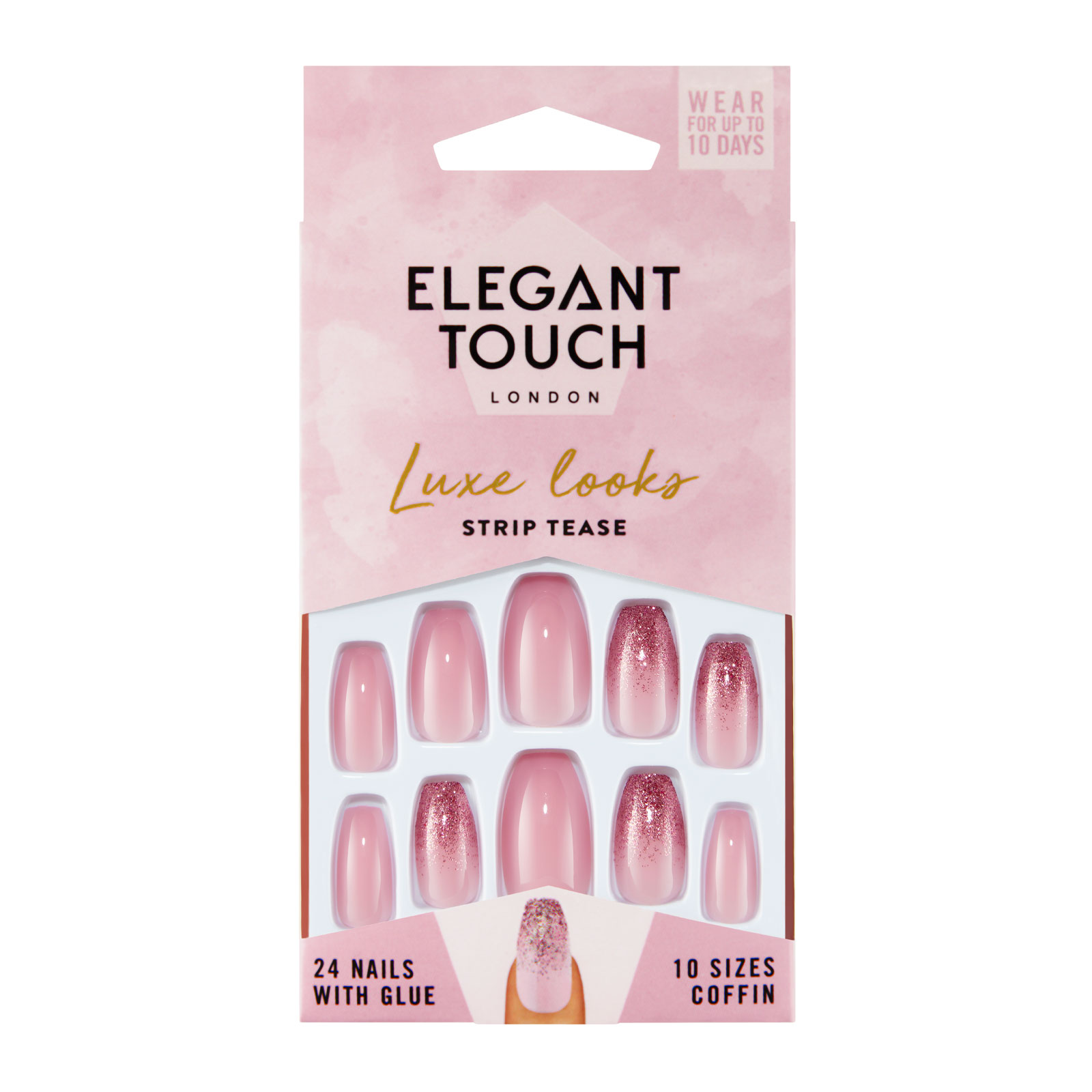 Put on a show with Elegant Touch Luxe Looks Nails Strip Tease! These glossy coffin nails with pink glitter ombre tips are such a vibe Don’t worry about your outfit - let your nails do the talking!