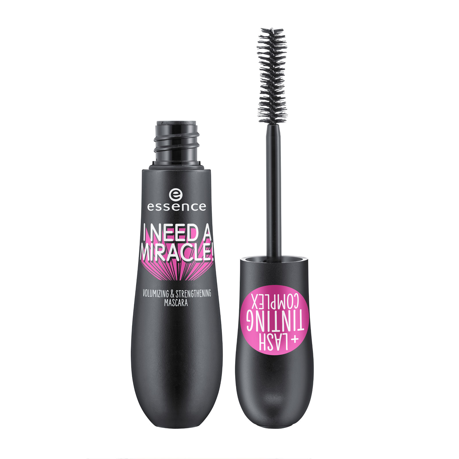 The Essence I Need A Miracle! Volumizing & Strengthening Mascara with a special “peanut-shaped” brush provides long lashes with thick, breathtaking volume With a specially developed tint complex, the mascara strengthens the lashes and covers them with colour with just one application