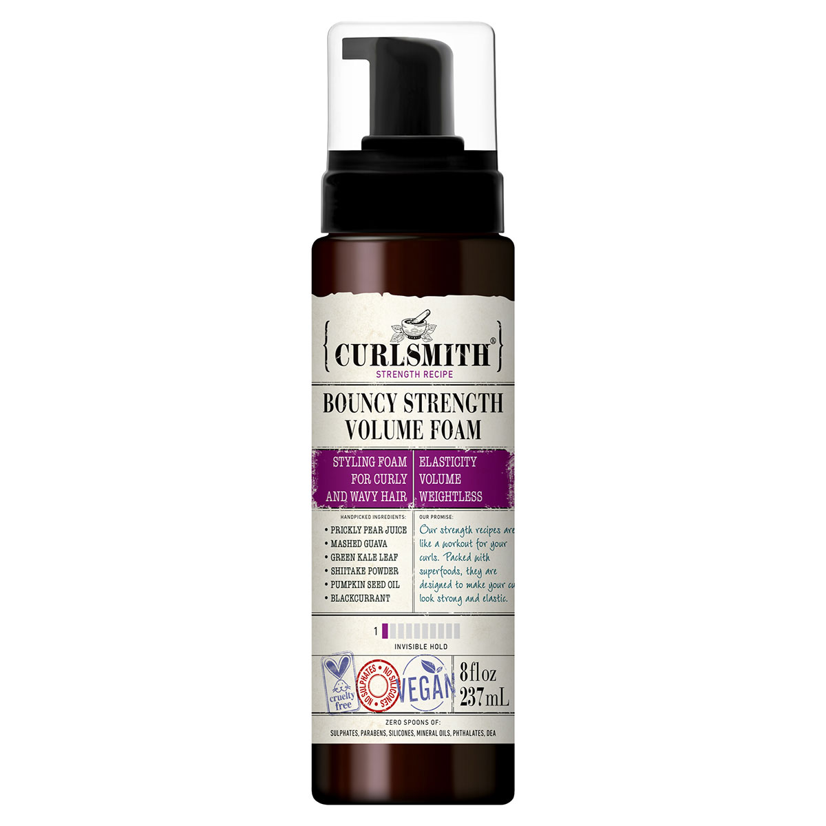 Curlsmith Bouncy Strength Volume Foam is a weightless protein-enriched styler that provides light hold and volume while enhancing your natural hair texture