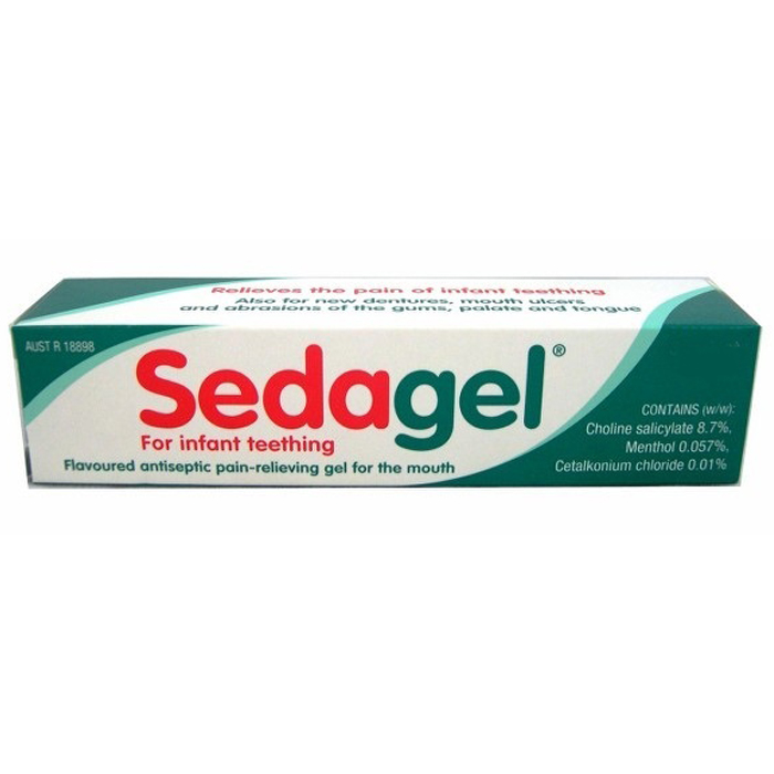 Sedagel relieves the pain of infant teething The active ingredients choline salicylate, cetalkonium chloride and menthol provide relief without causing allergic reactions or side effects Sedagel is also suitable for new dentures, mouth ulcers, and abrasions of the gums, palate and tongue