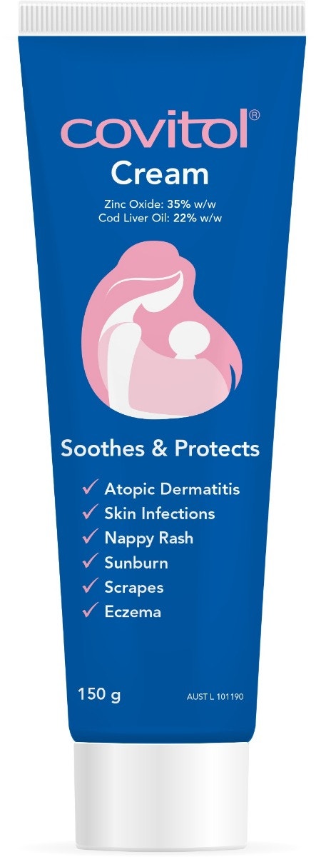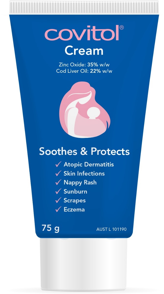 Covitol provides a thick, smooth barrier for long lasting protection It helps relieve eczema, sunburn, cuts, scrapes, skin infections and nappy rash Specially formulated with high levels of cod liver oil, zinc oxide, paraffin and lanolin Together they seal out wetness and germs to help skin irritations disappear quickly