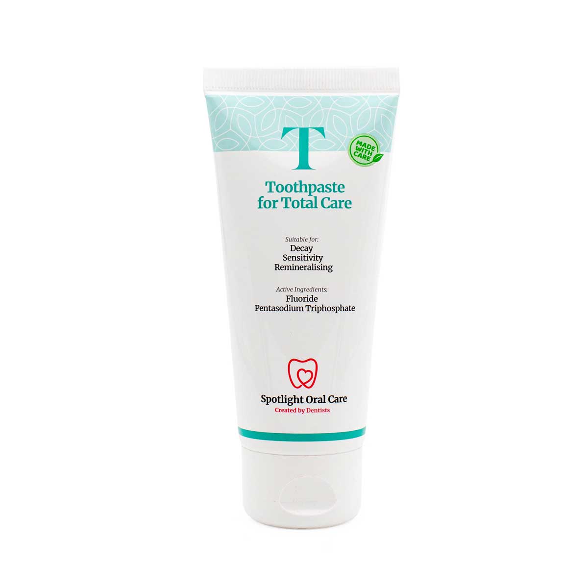 Spotlight Oral Care Toothpaste for Total Care is formulated to protect, desensitise and remineralise enamel using the active ingredients Fluoride and Pentasodium Triphosphate Designed specifically to combat decay, sensitivity and enamel erosion, this toothpaste supports oral health and leaves your mouth feeling amazingly clean and refreshed