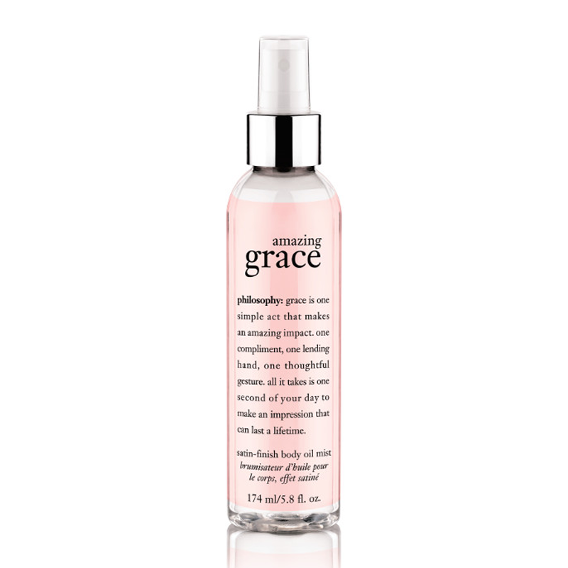 Amazing grace satin-finish body oil mist is enriched with natural oils to moisturise and condition for luxuriously soft skin A clean floral scent of welcoming bergamot to greet the senses, irresistibly soft, clean muguet blossoms and lasting musk with its classic beauty