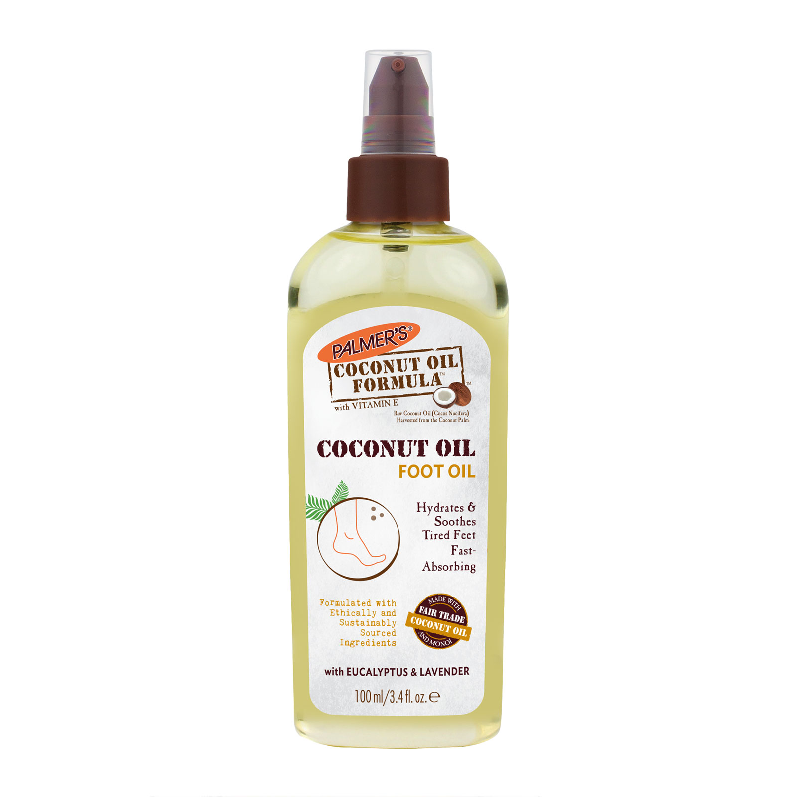 This Palmer s Coconut Massage Oil For Feet hydrate and soothe tired feet with the natural powers of coconut, eucalyptus and lavender oils Its formula is fast-absorbing, it hydrates and soothes tired feet Formulated with ethically and sustainably sourced ingredients