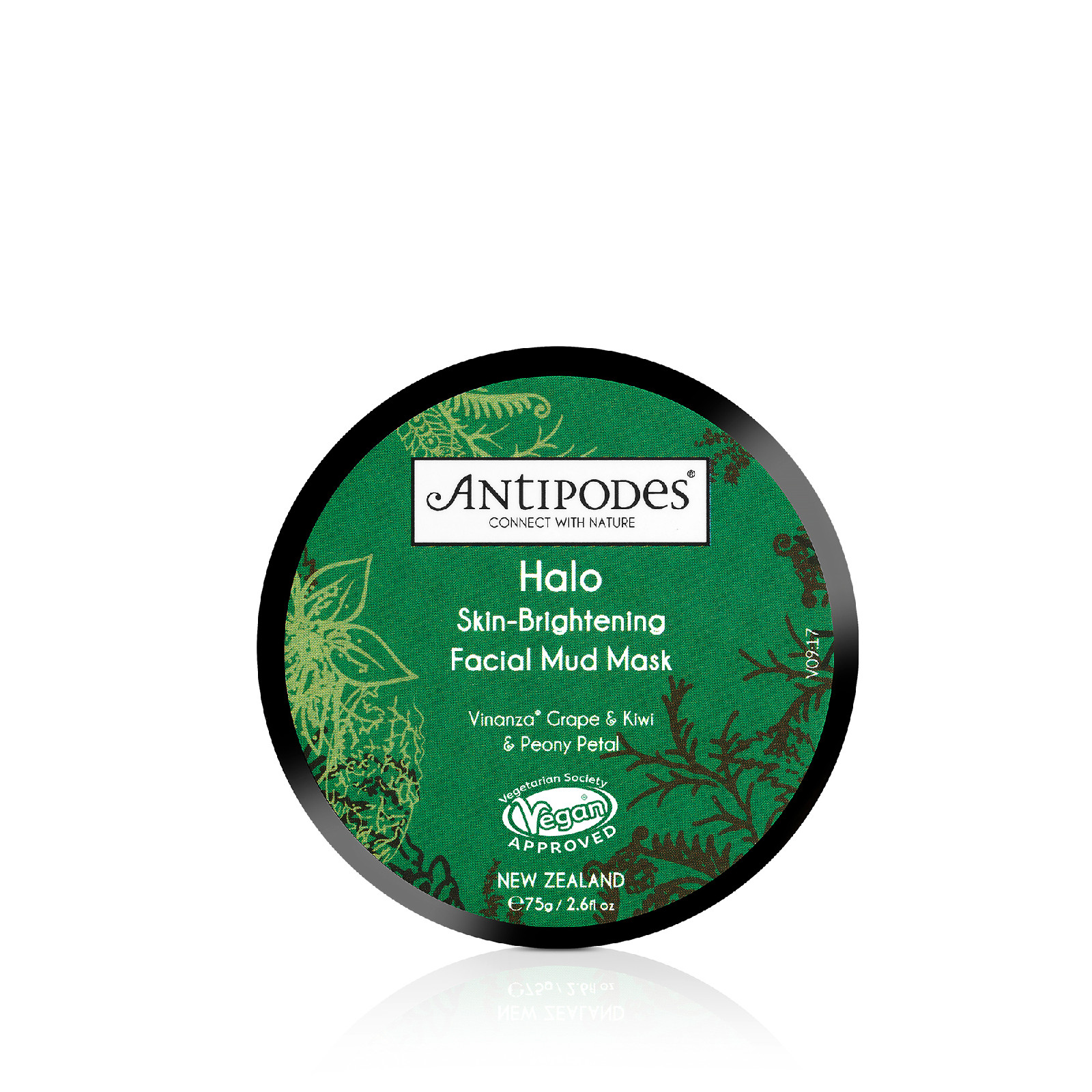 Antipodes Halo Skin - mud-paint your face to deeply deliver skin-brightening extracts for instant light and lift Improve your skin’s appearance with antioxidant compound Vinanza? Grape & Kiwi, clinically shown to lighten skin by targeting melanin production*