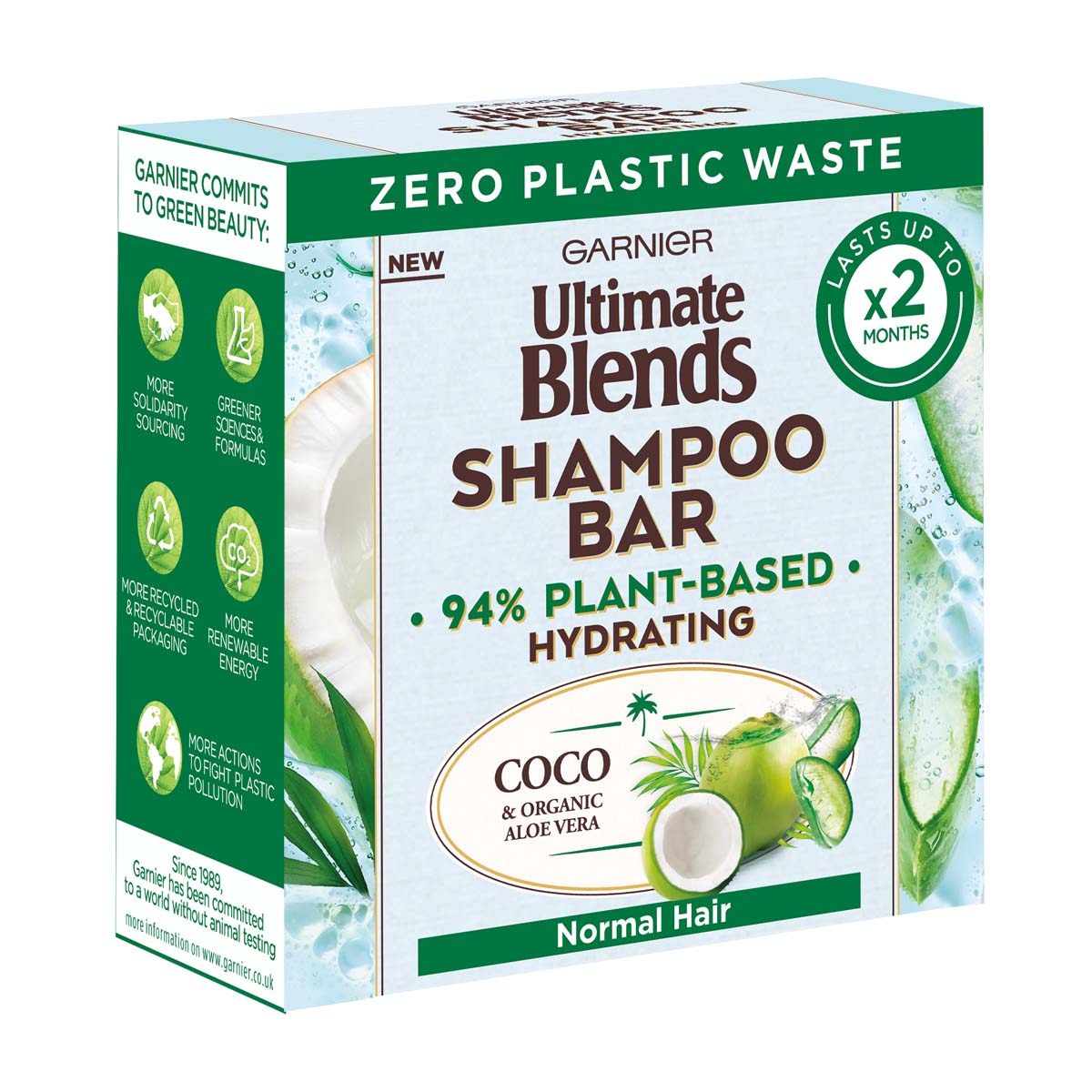 Join the shampoo revolution and try Garnier Ultimate Blends Coconut Hydrating Shampoo Bar, with Aloe Vera for Normal Hair Our Coconut Solid Shampoo Bar is blended in a gentle recipe, with sustainably sourced ingredients, including Coconut Oil & Organic Aloe Vera, to nourish & hydrate hair