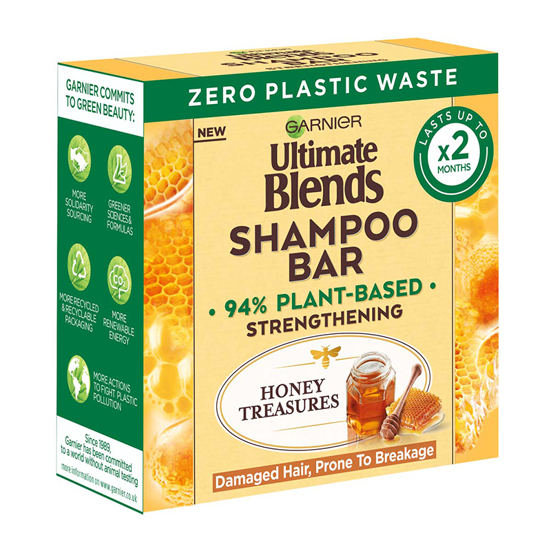 Join the shampoo revolution and try Garnier Ultimate Blends Honey Treasures Strengthening Shampoo Bar for damaged hair, prone to breakage Our Honey Treasures Solid Shampoo Bar is blended with sustainably sourced ingredients, including Honey & Beeswax, to nourish and protect hair